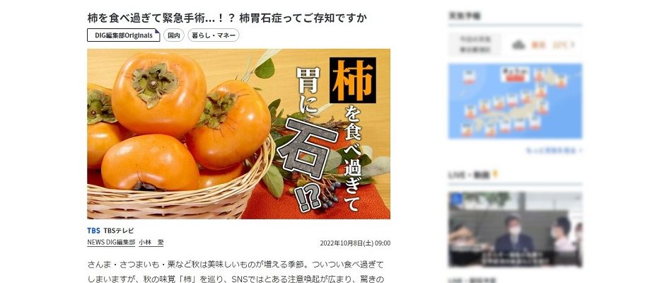 TBS NEWS DIGサイトにて、院長 芳賀による柿胃石についてのインタビュー記事が掲載されています。 https://newsdig.tbs.co.jp/articles/-/168293